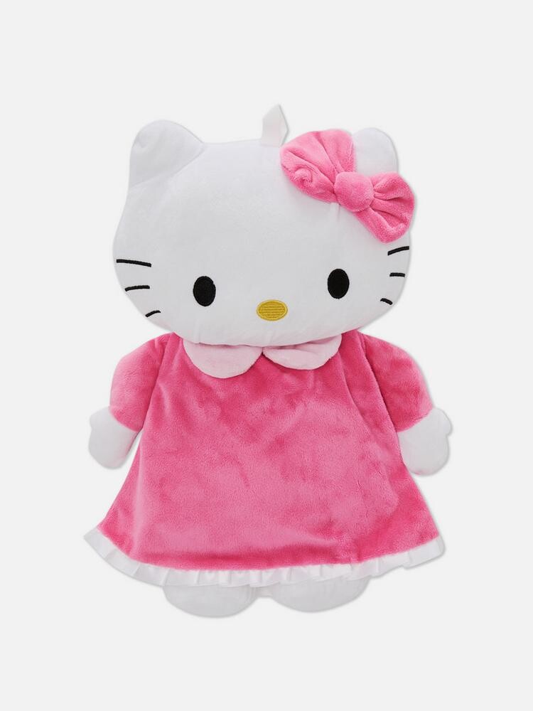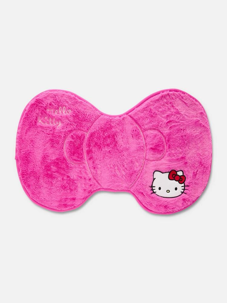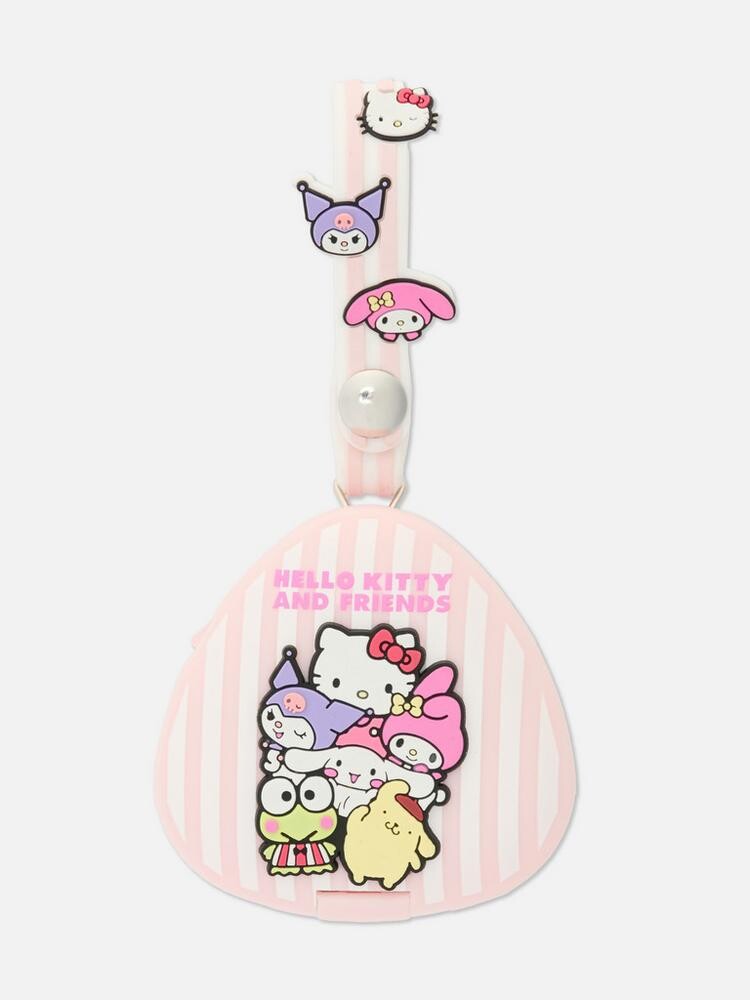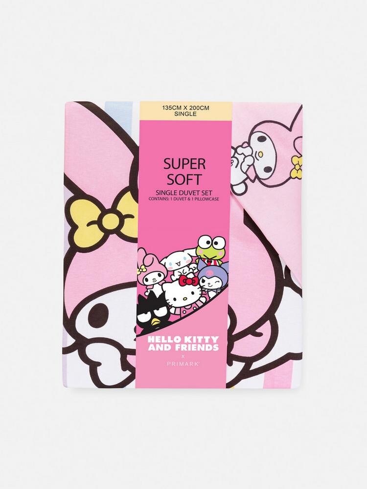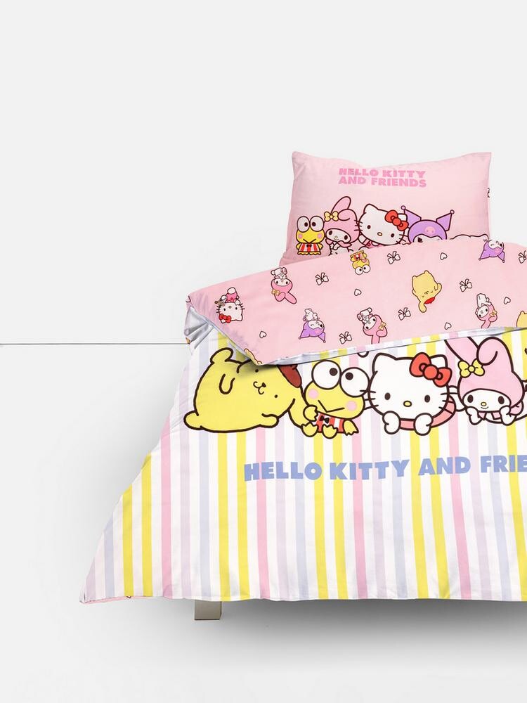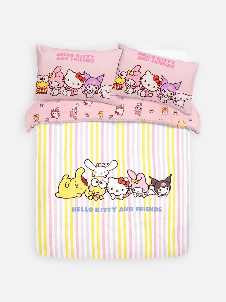 한쪽 면에는 핑크, 화이트, 옐로우의 파스텔 스트라이프가 특징이며, 하단에는 헬로키티, 쿠로미, 마이멜로디, 포차코, 시나모롤이 귀엽게 프린팅 되어 있어요. 뒤집어서 캐릭터 그래픽이 반복되고 베갯잇에 "HELLO KITTY AND FRIENDS" 텍스트가 세겨져 있어요 .