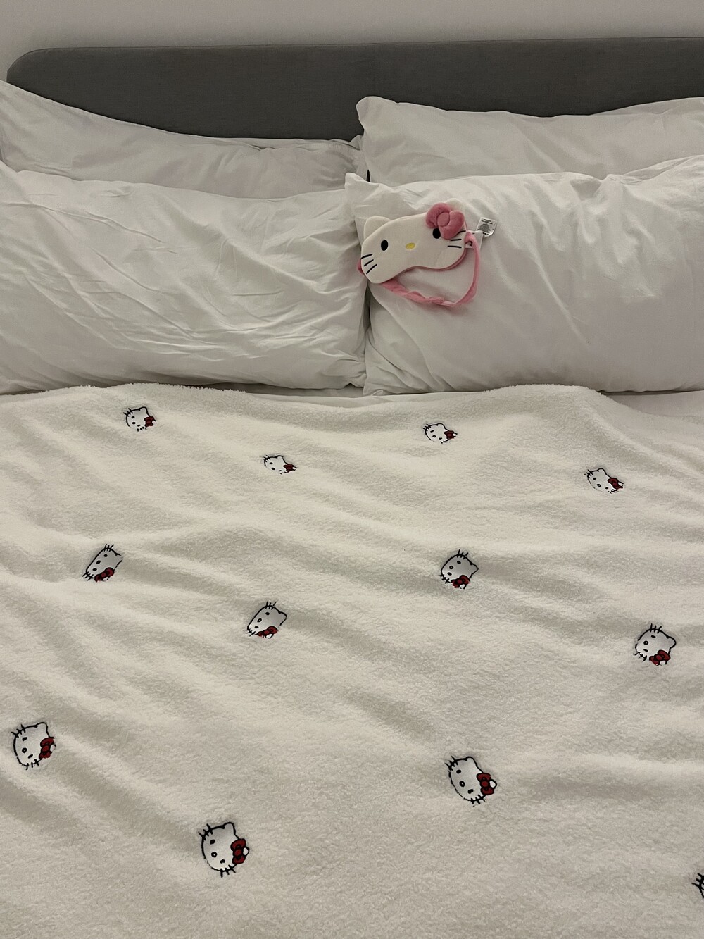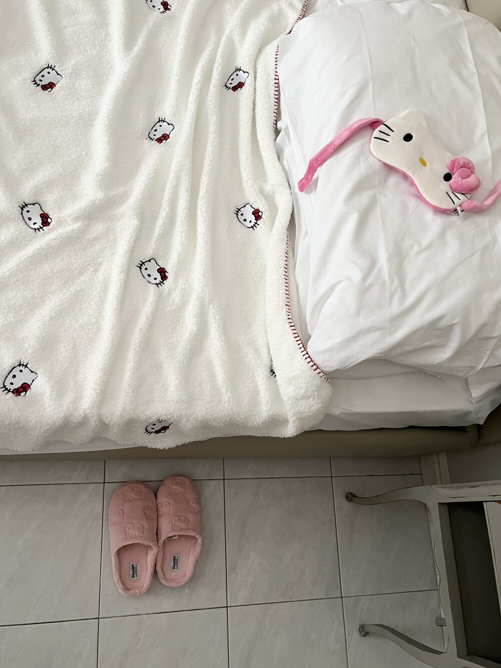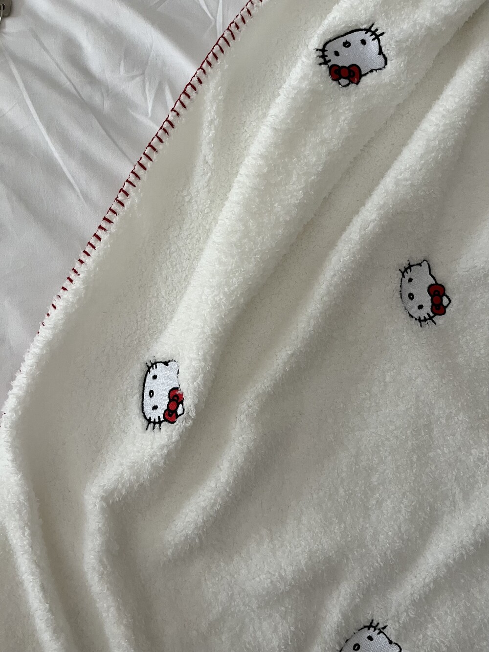 겨울 필수템 ! 담요로 출시된 제품 이나 저는 블랭킷 으로 사용해도 충분할거 같아요 !레드 자수 키티 페이스 자수가 포인트로 너무 귀여운 담요에요 🤍 실제로 많이 두꺼운 두께감이에요 !