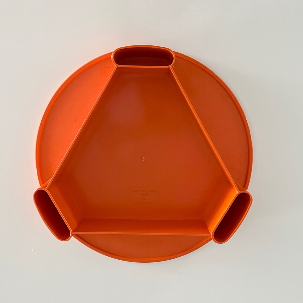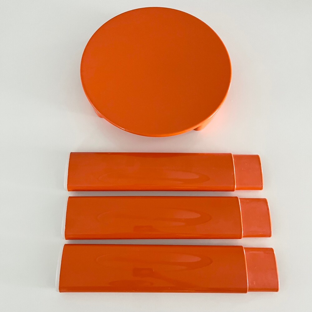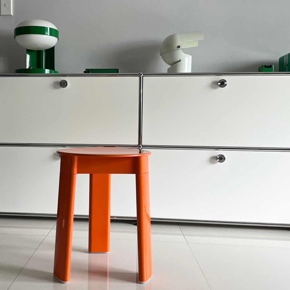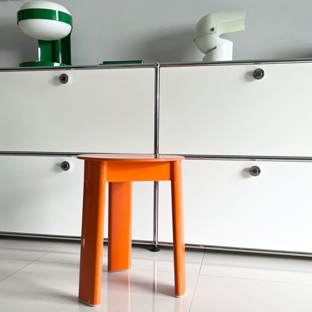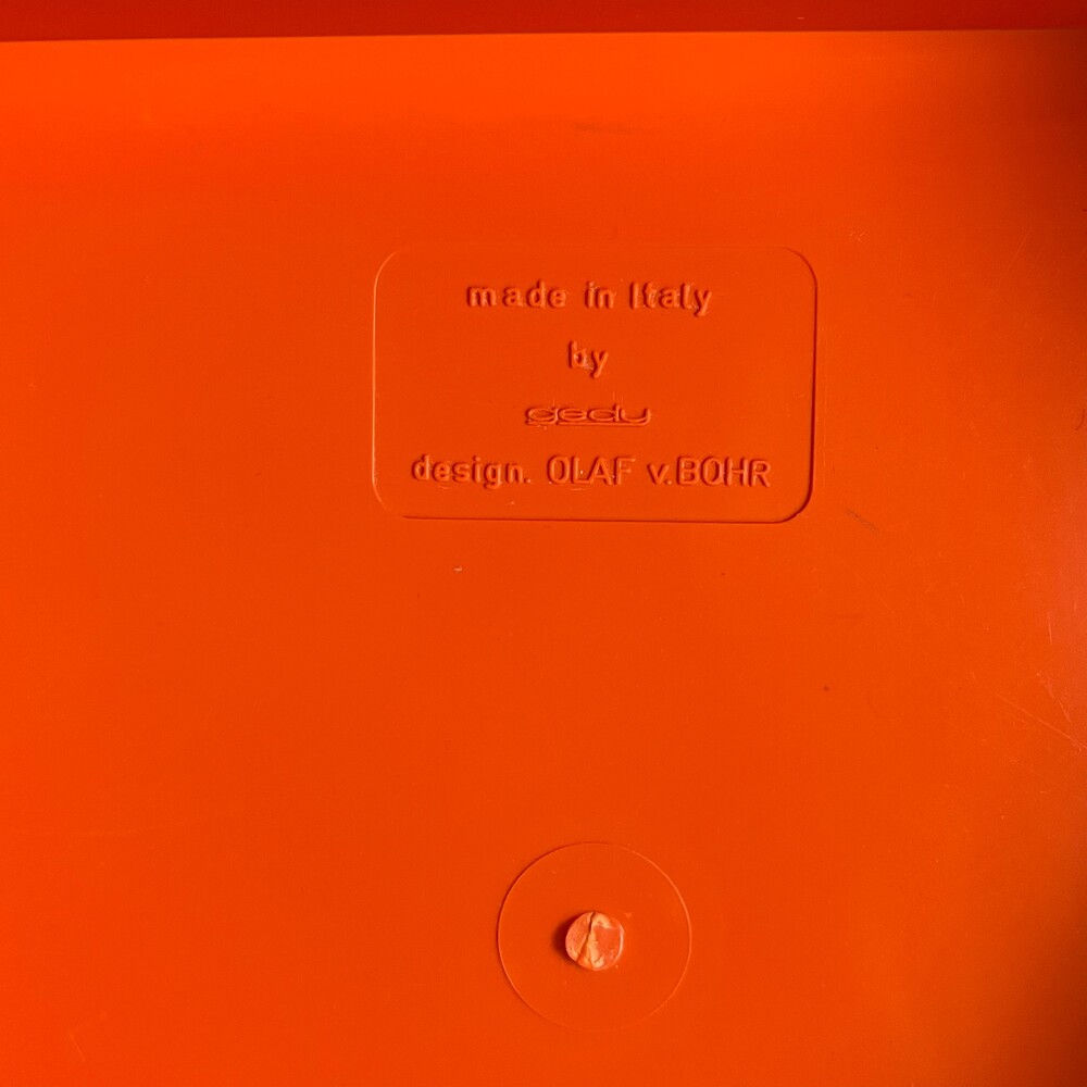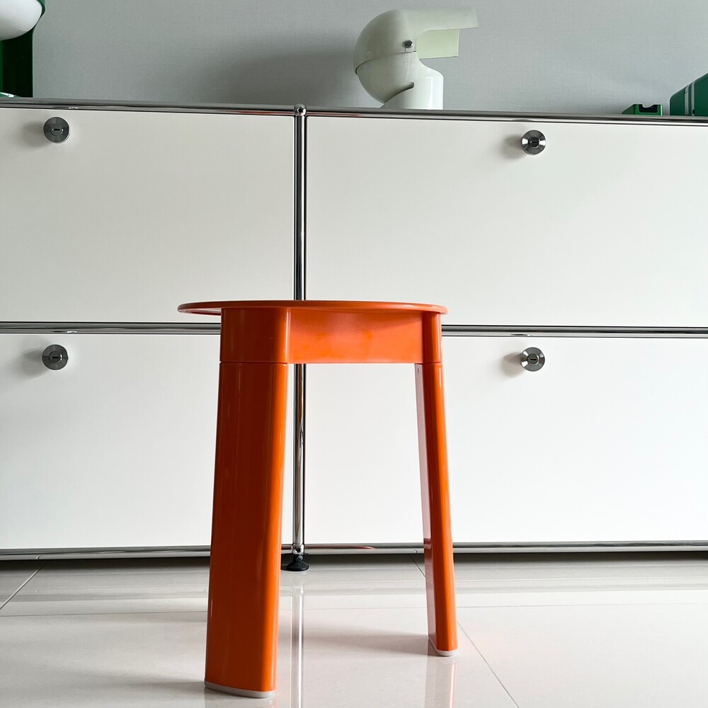 -1970년대 디자이너 Olaf von Bohr 가 Gedy 사를 위해 디자인한 트리오 스툴이에요. 오렌지 컬러의 ABS 플라스틱 소재로 만들어져 견고합니다. 원래의 용도는 스툴이나 책 ,화분,조명 소품 오브제를 올려두는 사이드 테이블로 사용가능 하여 유용한 아이템 입니다. 3개의 다리는 분리가 가능하여 이동 보관이 편리해요. 오렌지 컬러를 포인트로 어느공간에서 사용할수 있어요. 상판에 기스가 있어요. 사진으로 확인해주세요. 상판에 기스를 제외한 나머지 컨디션은 좋은편이나 빈티지 특성상 세월의 흔적은 존재해요.