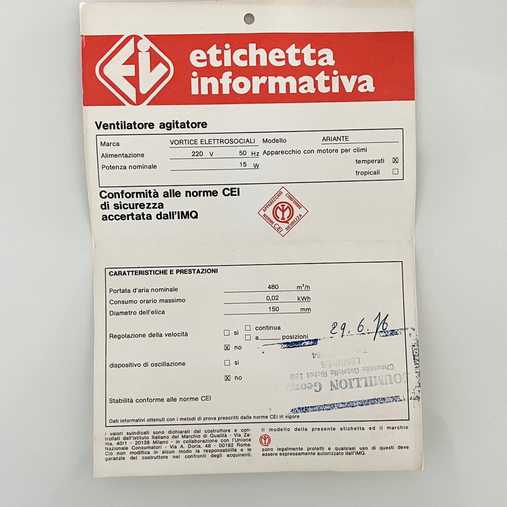 - 70년대 이탈리아에서 제작된 밀라노 건축가이자 디자이너인 Marco Zanuso 가 Vortice Elettrosociali 회사를 위해 만든 팬 선풍기 입니다.