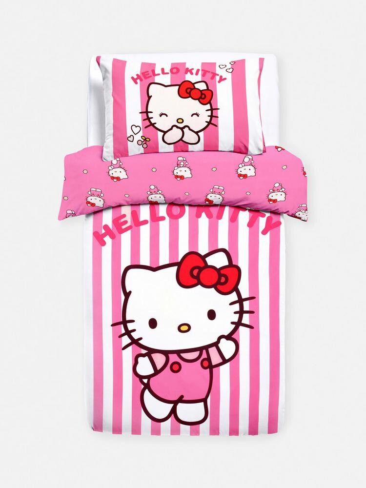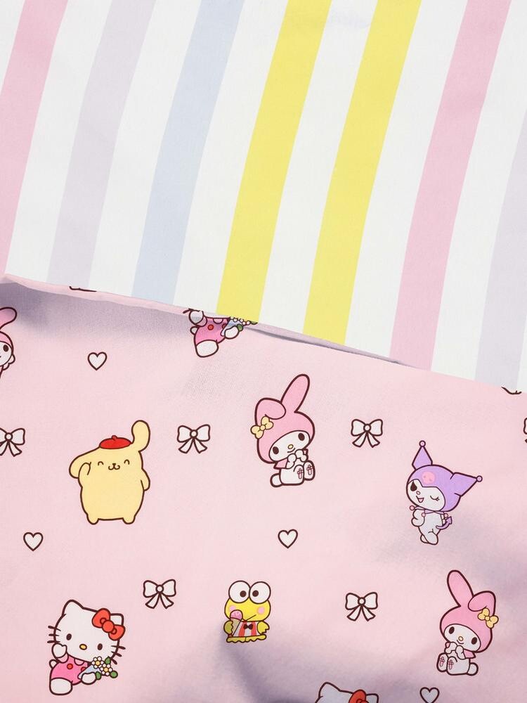 한쪽 면에는 핑크, 화이트, 옐로우의 파스텔 스트라이프가 특징이며, 하단에는 헬로키티, 쿠로미, 마이멜로디, 포차코, 시나모롤이 귀엽게 프린팅 되어 있어요. 뒤집어서 캐릭터 그래픽이 반복되고 베갯잇에 "HELLO KITTY AND FRIENDS" 텍스트가 세겨져 있어요 .