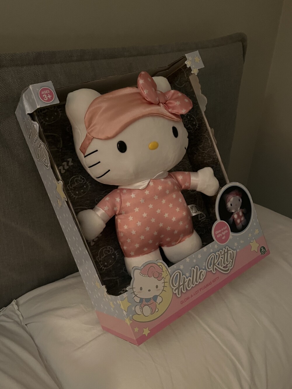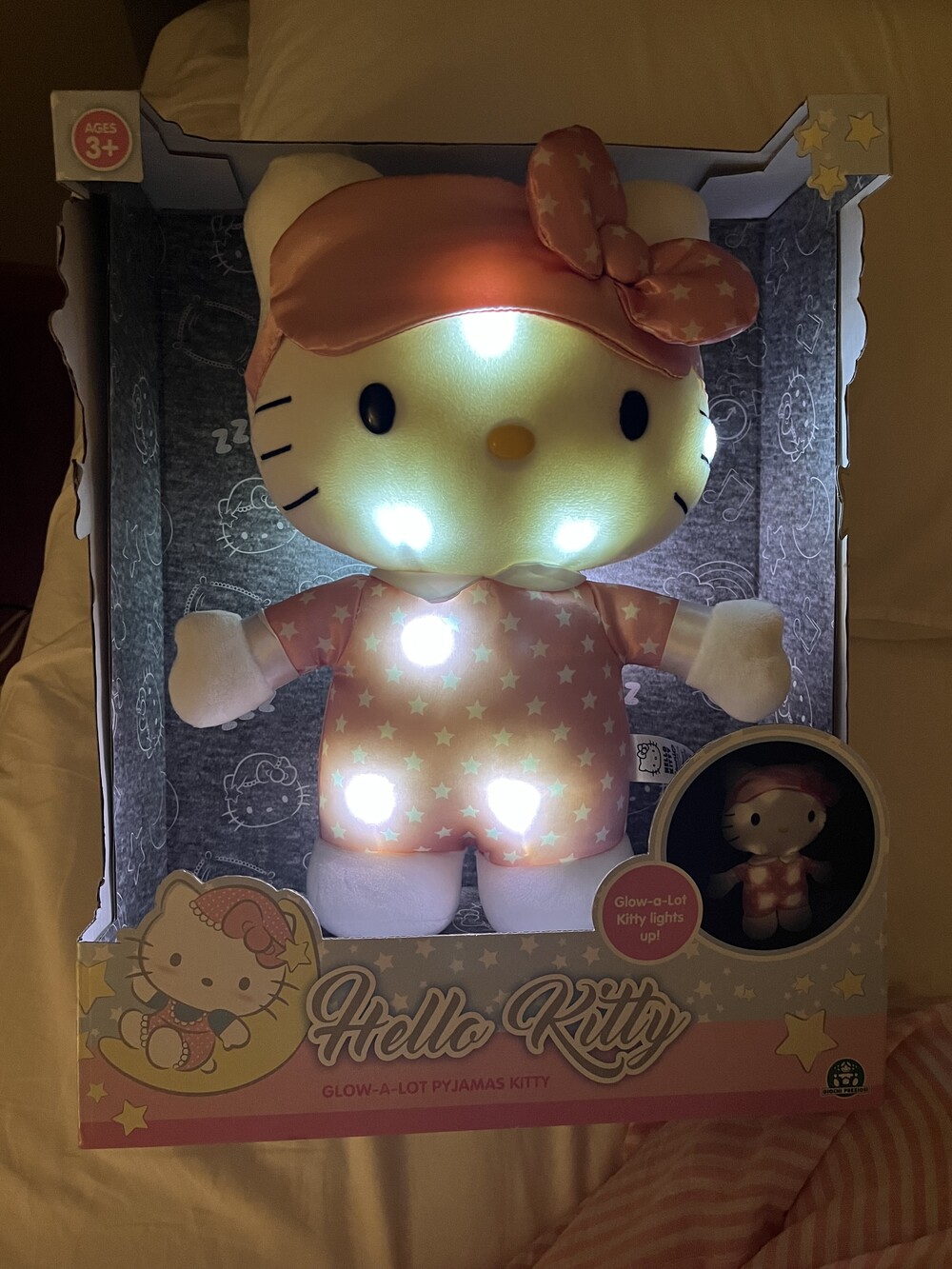 헬로 키티의 손을 누르면 귀여운 봉제 인형이 은은하게 빛나며 불빛이 들어와요 ! 조명과 함께 달콤한 멜로디가 흘러나오는 귀여운 파자마 인형이에요 ✨🙏🏻 조명을 끄고 멜로디만 흘러나오게 할 수 있는 기능도 포함되어있어요 . 잠옷과 수면 마스크를 착용한 사랑스러운 디자인의 이 헬로 키티 봉제 인형은 기능성과 귀여움을 모두 갖추고 있어 어른 어린아이들에게 모두 추천 드려요.